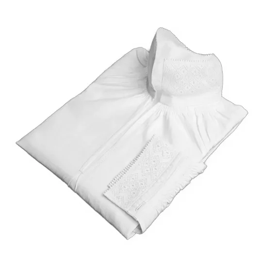 Linskjorte med hullsømbroderier på hals og ermelinninger.