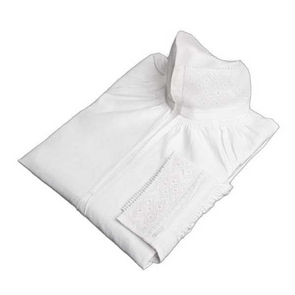 Hvit bunadskjorte i lin med broderier på hals og ermelinninger.