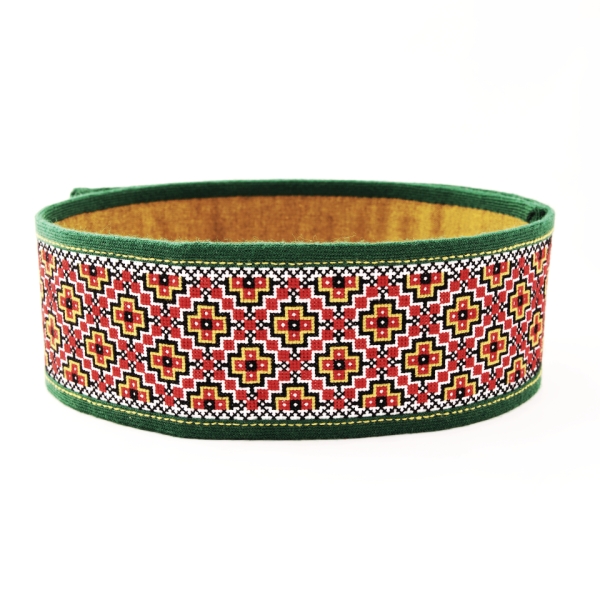 Til bunaden brukes et bredt korsstingsbrodert belte.