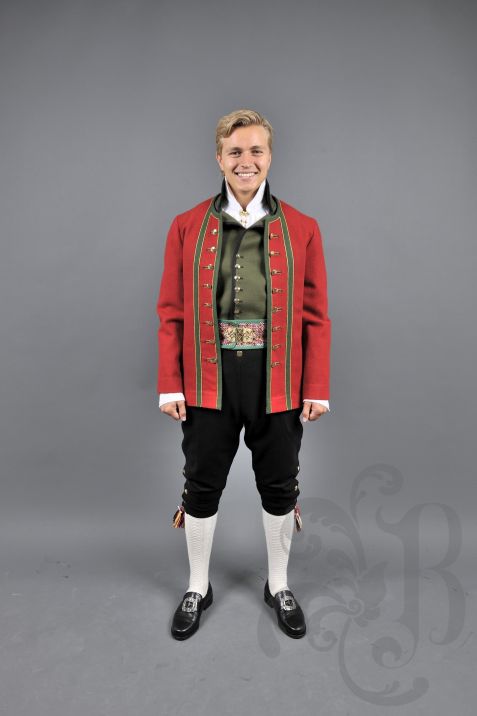 Inkludert i prisen er ferdig brodert og montert jakke, vest, nikkers og skjorte.