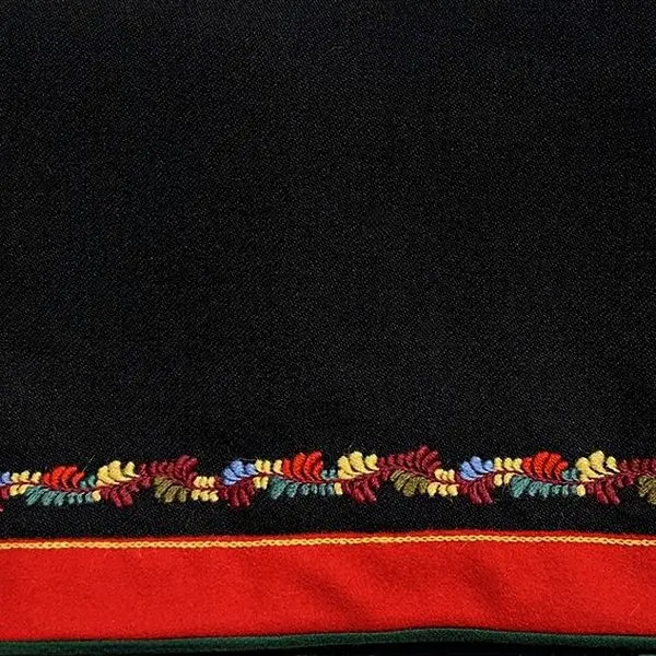 Stakken er i sort vadmel med rynking i ryggen. Nederst er den kantet med rød og grønn kant.