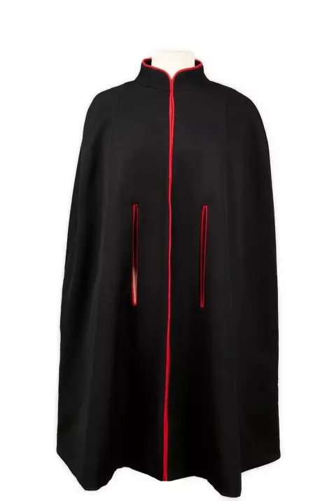 Cape til Hardangerbunad i drapé. eller to-skaft med rødt fôr. .Vennligst spesifiser ønsket lengde (FL) og din totale høyde (TH) i notatfeltet.Lengden måler du i åpningen(uten krage), fra halsgrop og loddrett ned til ønsket lengde. .Prisen inkluderer ikke sølvspenne.Sølv kjøpt hos oss monteres kostnadsfritt.