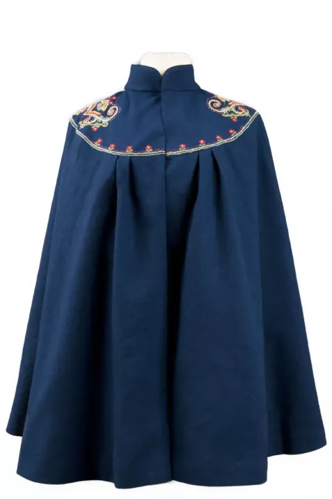 Cape til Vestfoldbunad 1932 (blå/sort- toskaft/klede) .Vennligst spesifiser farge, stoffkvalitet (toskaft eller klede), ønsket lengde (FL) og din totale høyde (TH) i notatfeltet.Lengden måler du i åpningen(uten krage), fra halsgrop og loddrett ned til ønsket lengde. .Prisen inkluderer ikke sølvspenne.Sølv kjøpt hos oss monteres kostnadsfritt.