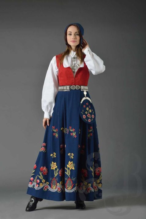 Stakken er i blå to-skaft. Den er lagt i løse, brede folder rundt livet. Langs stakkekanten, er det en brodert blomsterbord i ullgarn og metalltråd.
