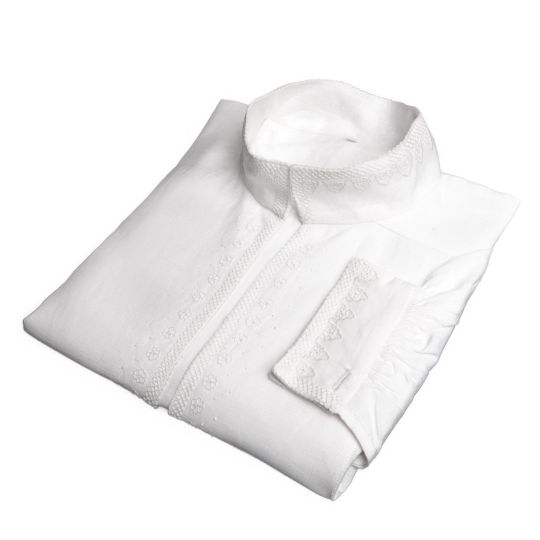 Linskjorte med hvite broderier på krage, skulderstykker, mansjetter og ved halssplitt.