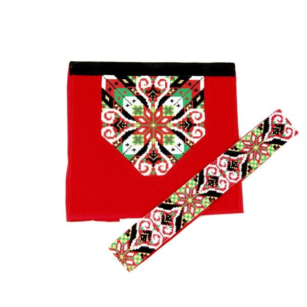Brodert belte følger samme mønster og farge som bringeduk og lukkes med en sølvspenne. Alternativt kan man bruke skinnlist med støler.