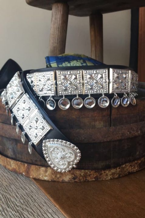 Hvitt sølvbelte for midje 89 - 91 cm med 25 beltestøler, 1 veskestøl og 1 beltespenne.